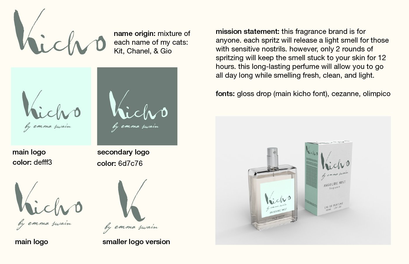 Kicho is a fictional fragrance concept that I created in order to experiment with packaging design as well as brand identity. This project was also an activity to help aid my skills in minimalism through design and continue working on Adobe Illustrator and Photoshop simultaneously.