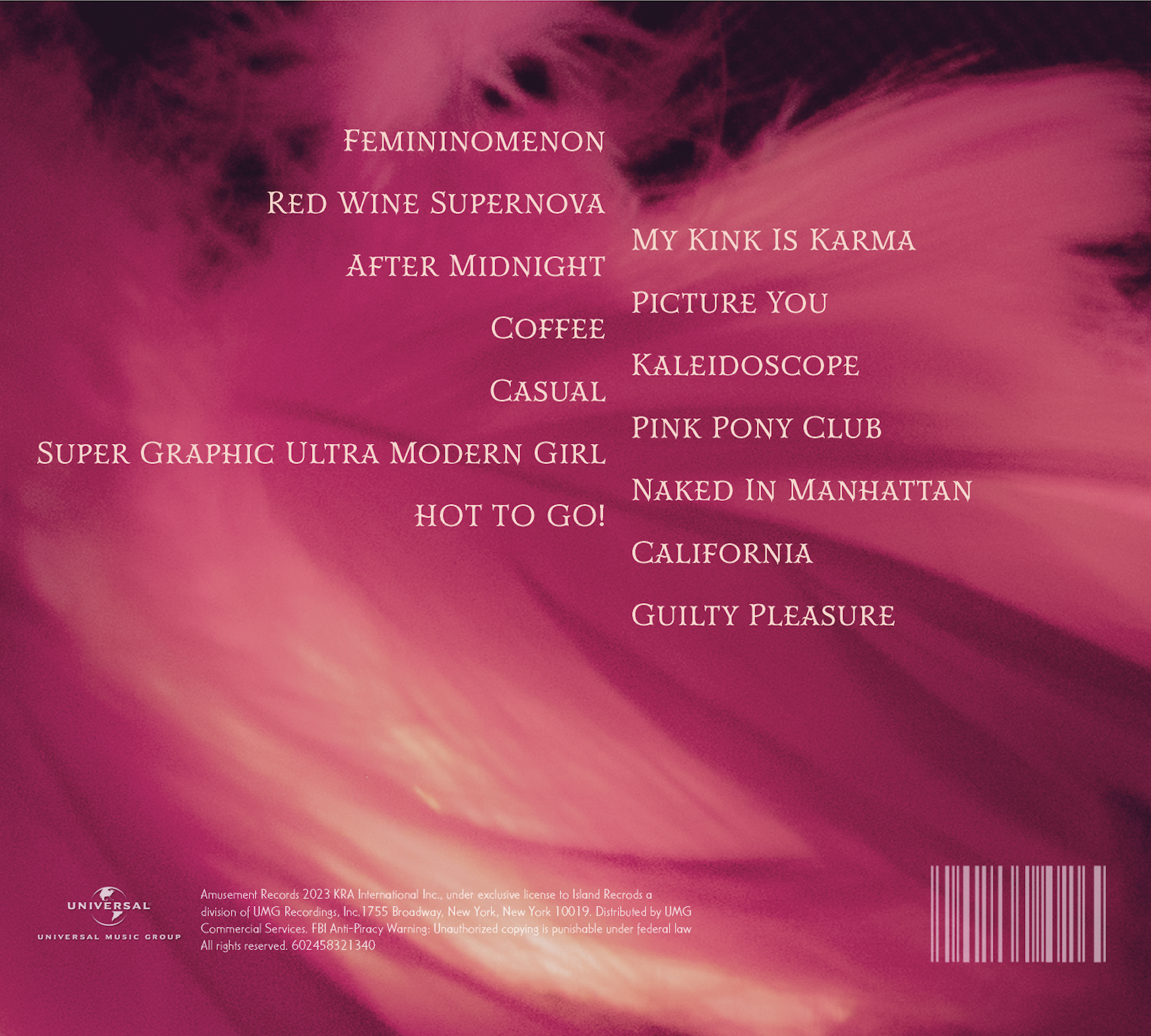 This is the final version of the front cover of my CD. I wanted to focus on creating the glamorous feel of the album's title and contents. The font used is Mr. Darcy. The artist’s name font is Helvetica Neue.